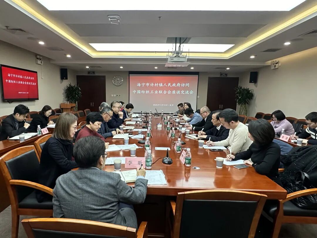 1月13日下午,海宁市许村镇人民政府携许村镇行业协(商)会代表到访中国纺织工业联合会。双方就许村纺织服装产业的发展情况、产业布局、区域品牌提升、产业推介及展贸对接等方面内容展开座谈交流。